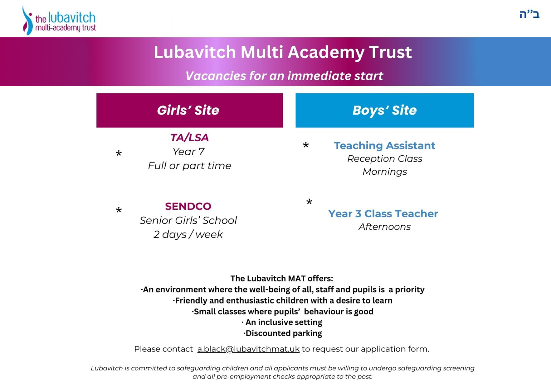 Please submit your completed application form to a.black@lubavitchmat.uk